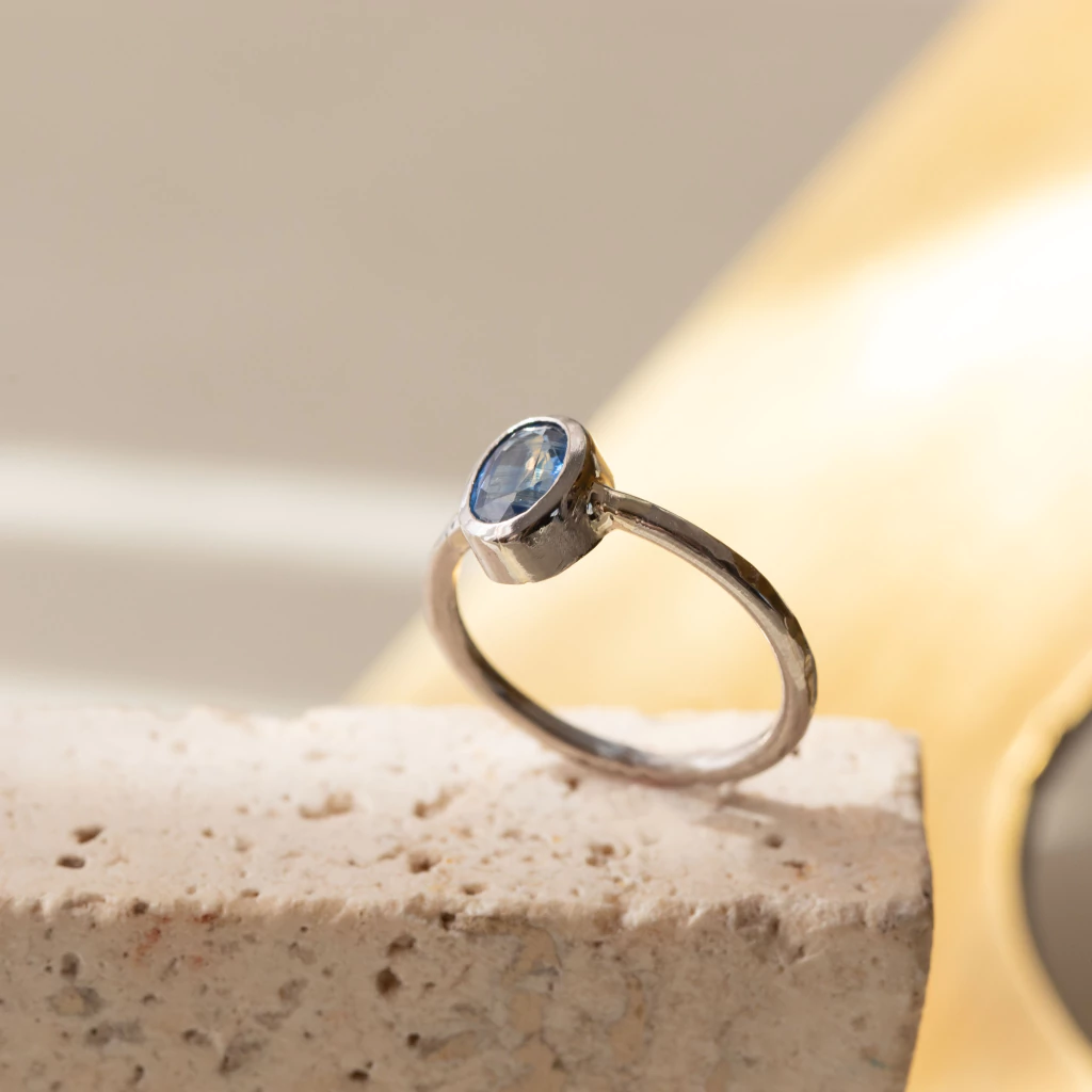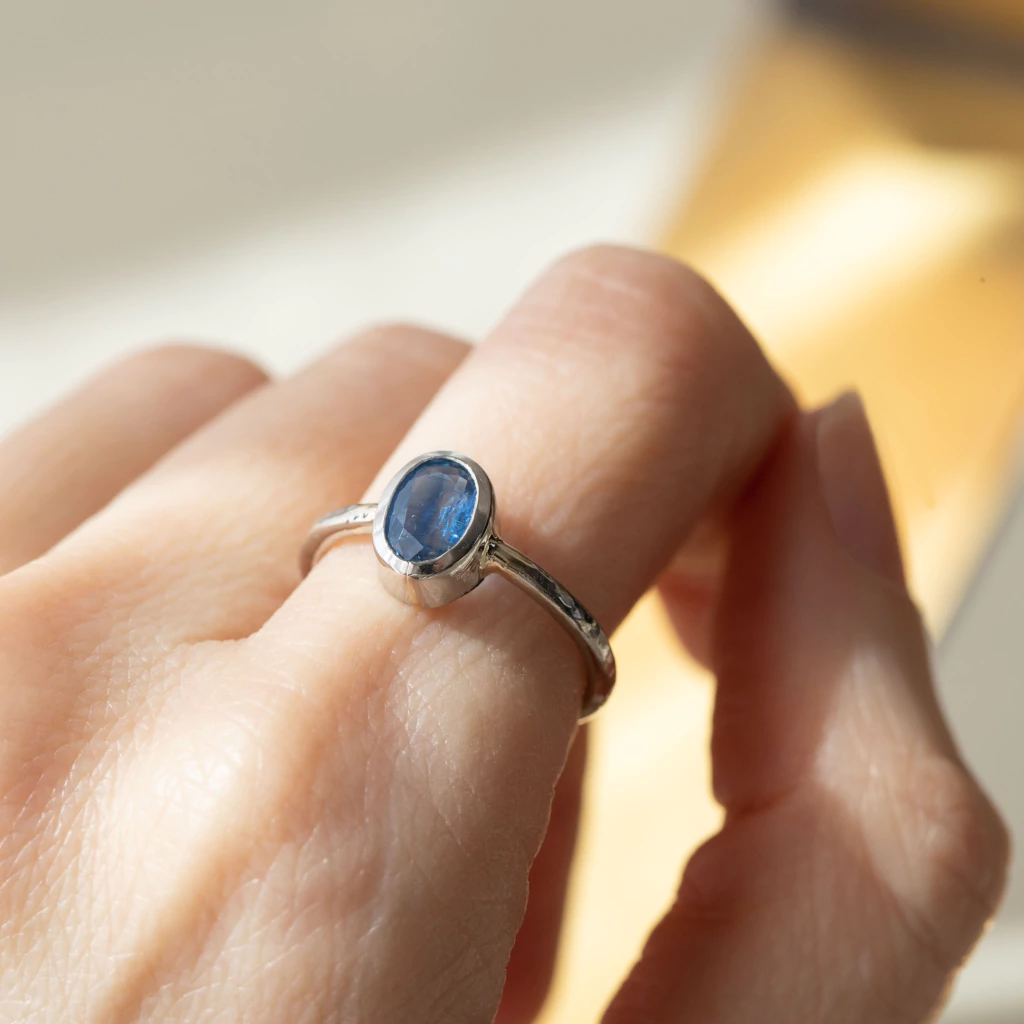 Anillo de platino con una Cianita de talla oval engarzada a mano.