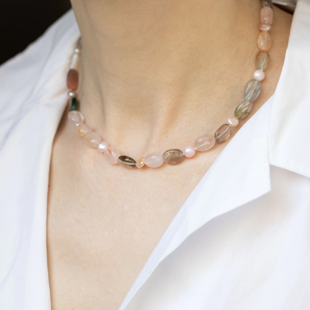 Collar de Plata 925 con cuentas de piedras naturales. Amatista, Cuarzo rosa,, Cuarzo fumé, entre otras.