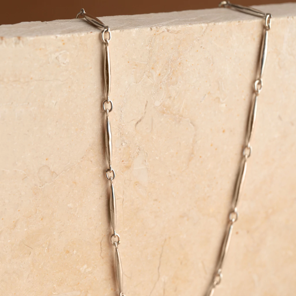 Una pieza minimalista, ideal para usar sola o como base para combinar con otros collares.
